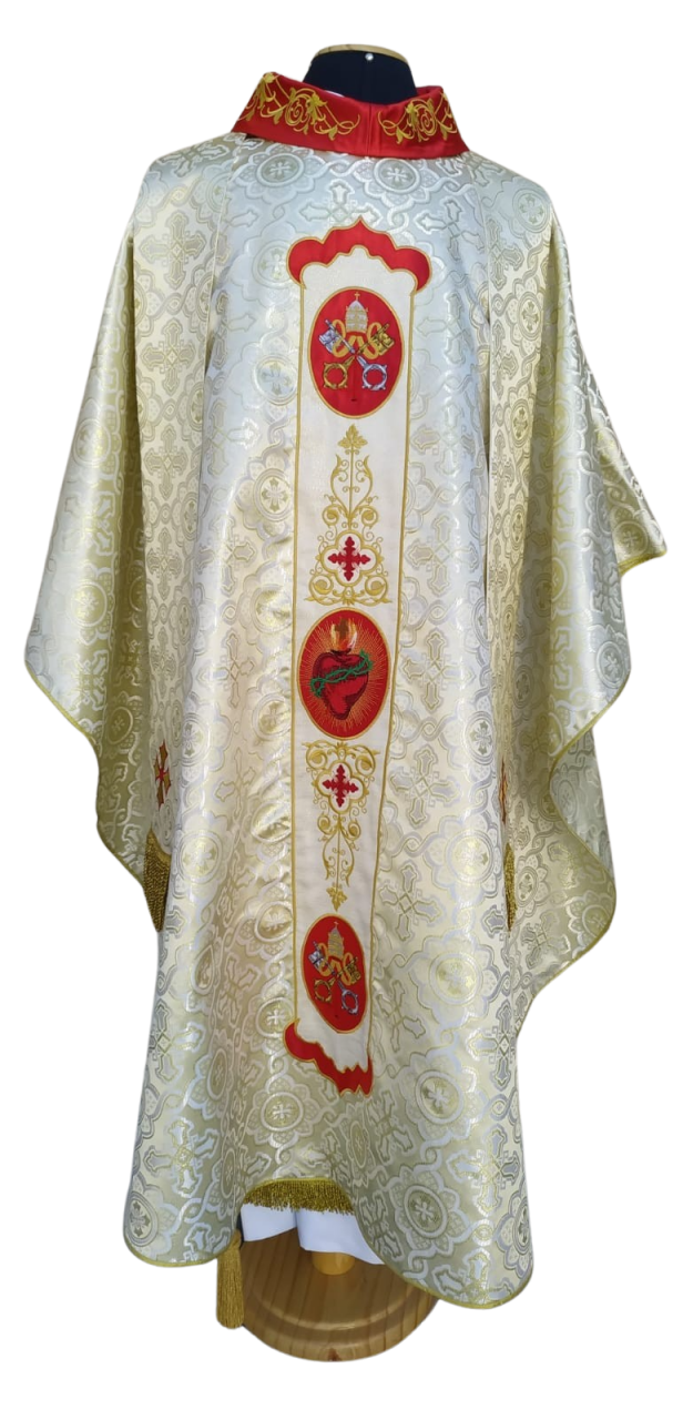 Detalhe: escapulário central bordado na própria casula, gola bordada com arabescos. Nos escapulários foram feitos apliques de tecidos nas cores creme com ranhuras douradas e vermelho.
