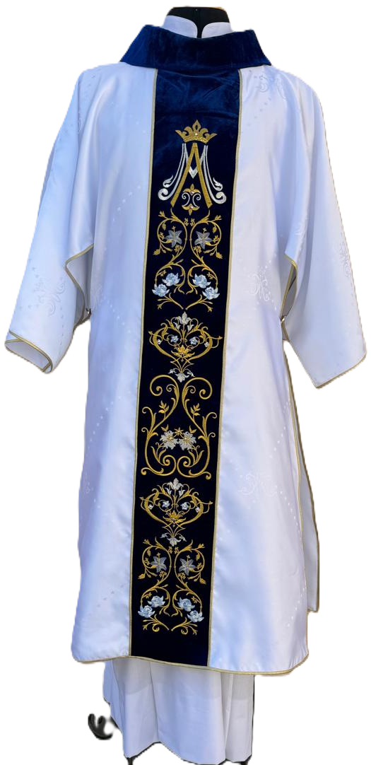 DALMÁTICA MARIANA EM TECIDO ADAMASCADO COM ANAGRAMA MARIANO E BORDADO COM LINHA IMPORTADA DE ALTA QUALIDADE.
