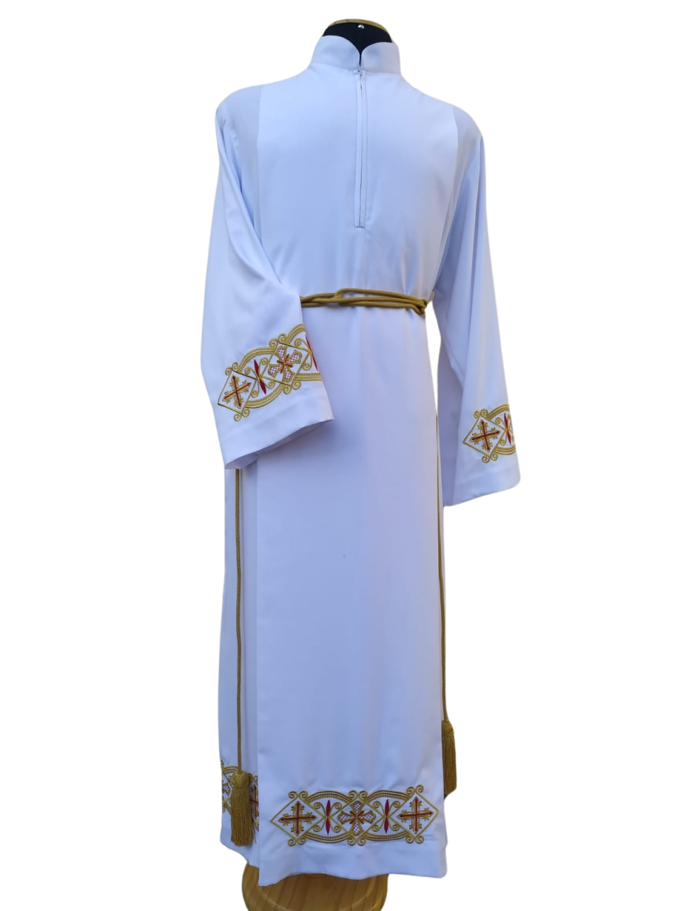 Bordada com linha metalizada importada da marca Madeira nas mangas e na barra.
